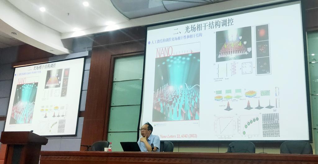 报告会上,蔡阳健教授首先介绍了山东师范大学光场调控及应用中心的建设情况,然后从部分相干光场的研究背景出发,介绍了部分相干光场的相干结构调控、测量和产生等概念。同时分享了课题组近年来在部分相干光场调控及应用方面的研究工作,包括具有非高斯关联相干结构的新型部分相干光场及其调控方法,并以部分相干光场特殊的传播特征为背景,介绍了部分相干光场在图像加密、自由空间光通信、大气参数测量、“鬼”成像、光束整形以及精密测量等前沿领域的应用。蔡阳健教授精彩的报告赢得了师生阵阵掌声。